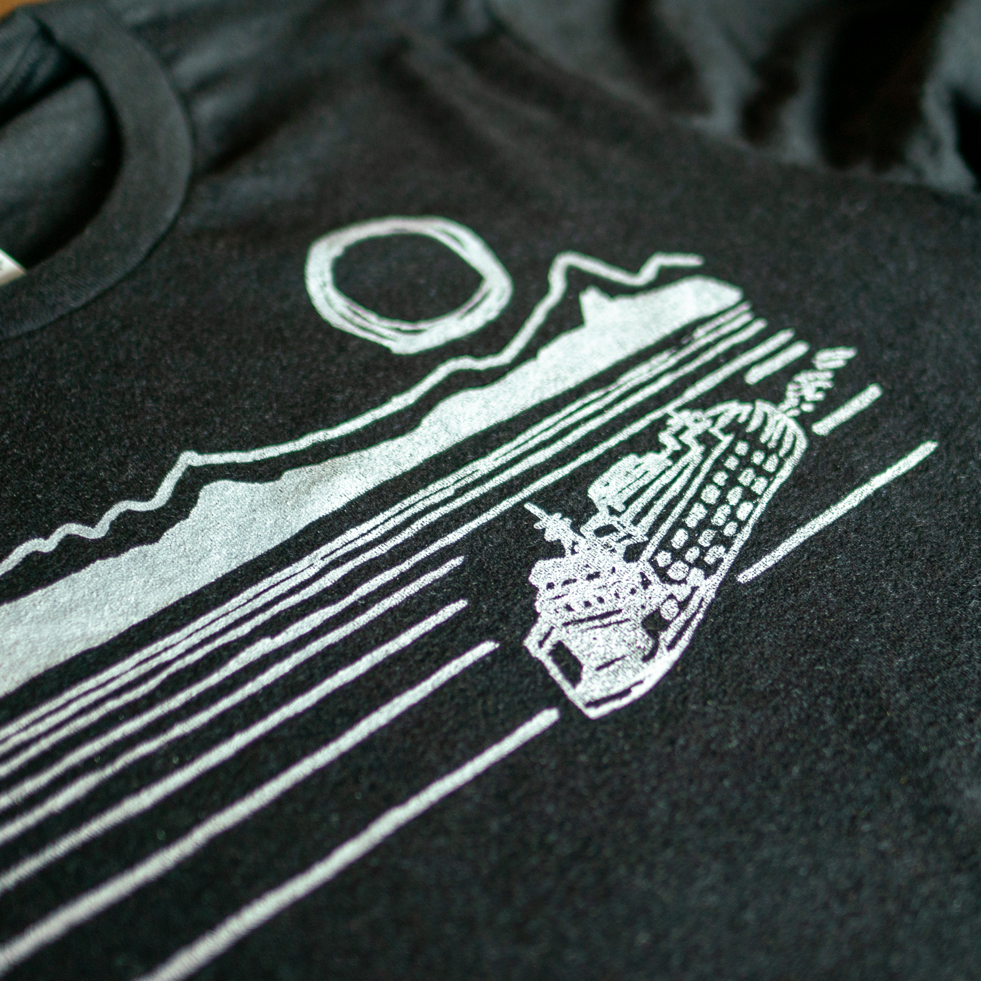 This is a super comfortable, soft, unisex T-shirt in Black Heather. The screenprint art is our design and is drawn by hand and screenprinted in house! White, water based ink on the dark background makes this design stand out.
